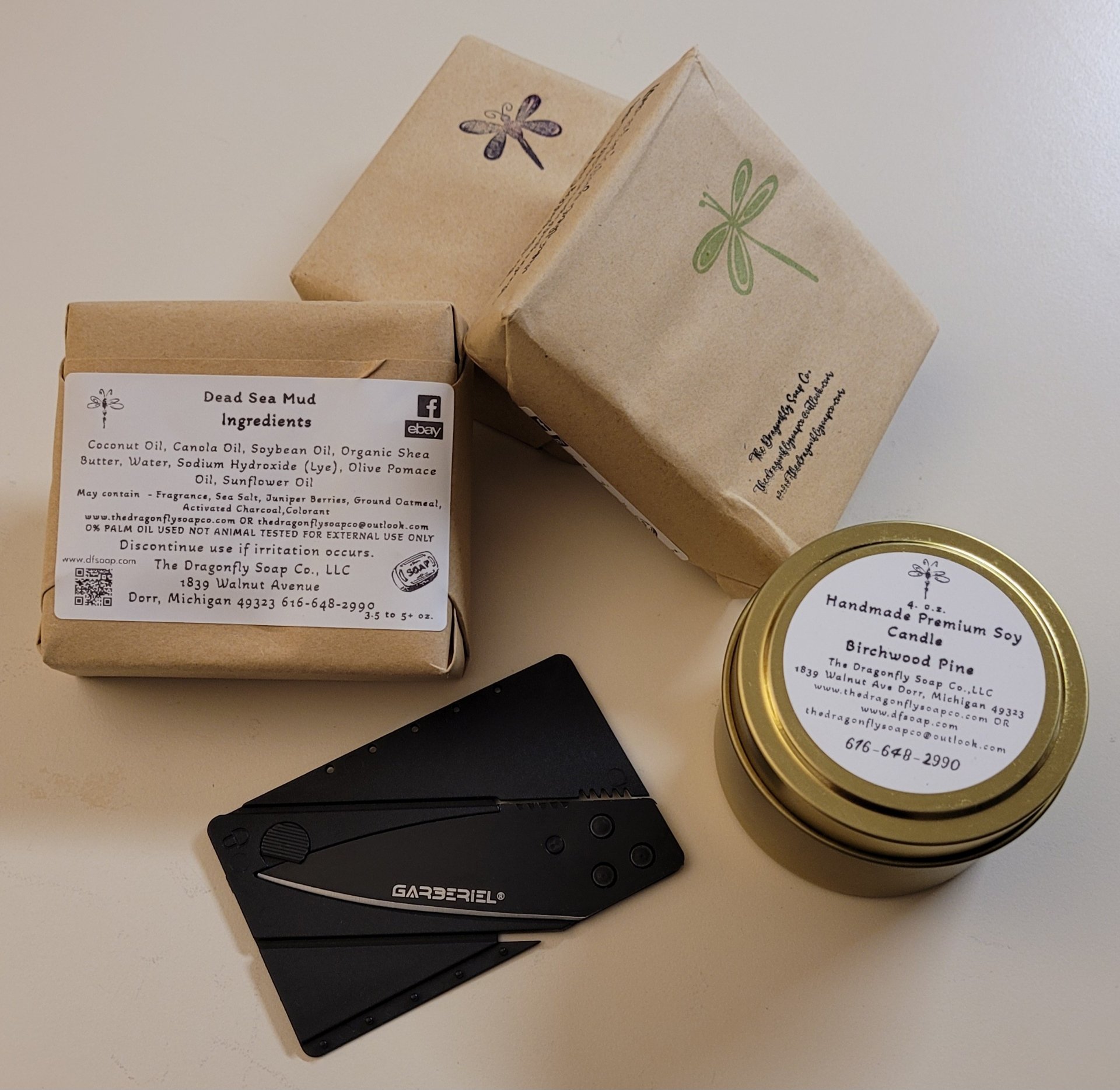 Back by popular demand, our Random gift bag deal is now a permanent option. These gift bags come with 3 wrapped bars of random scents from the 145 plus scents we have, 1 of our jarred products (Lotion, Mineral Powder or Sugar scrub) and a piece of handmade jewelry for the Feminine choice, OR 3 wrapped bars of random scents, a Candle and 1 Folding emergency pocketknife that fits in a Credit Card slot for the masculine.. We do our best to match scents to M or F.. AND YES They are all in a little bag all ready to gift. We even have a giftbag for those who just want a candle and wax melt with our 3 bars of soap.. Now If you have a business, large group or ANY questions or wants SIMPLY message us here through our website, Email, Call or TEXT message and we will reply ASAP and try to accommodate your wants and wishes to the best of our abilities. We can even custom group large packages together as well... And with our other products TOO!!!!